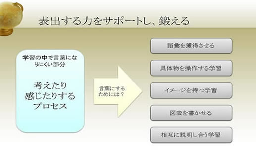 答えは案外一つである。学習者が自分の考えた道筋を言語化する場面である。これは意外なことかもしれないが、どの教科においてもそうである。その方法が、「話し合い」であったり、「図式化」であったり、「報告書」や「実験記録」であったりするが、こういった学習者の内面的な思考のプロセスを、形あるものとしてまさに表現させることが、それぞれの教科において「言語力」を必要とする場面である。